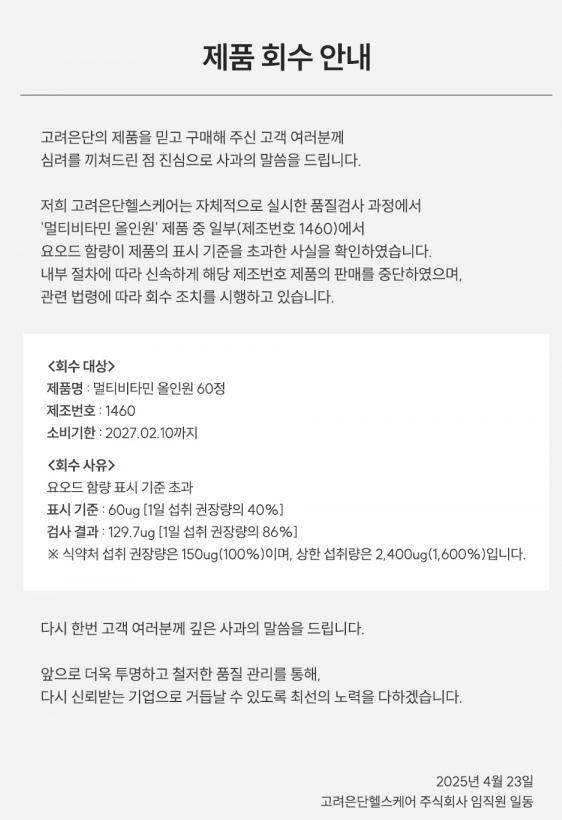 고려은단 비타민 회수 조치, 혹시 이 제품 집에 있으신가요?