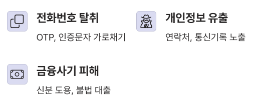 유심에 저장된 개인 연락처, 통신 기록 등이 외부로 유출될 수 있습니다. 최근 SKT 해킹 사고에서도 수많은 개인정보가 유출되면서, 통신 보안의 중요성이 다시 한번 강조되고 있습니다. - 금융사기 피해