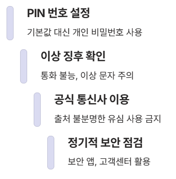유심에도 별도의 비밀번호(PIN 코드)를 설정할 수 있습니다. 기본값을 그대로 두지 말고, 꼭 본인이 설정한 PIN 번호를 사용하세요. - 이상 징후 즉시 확인