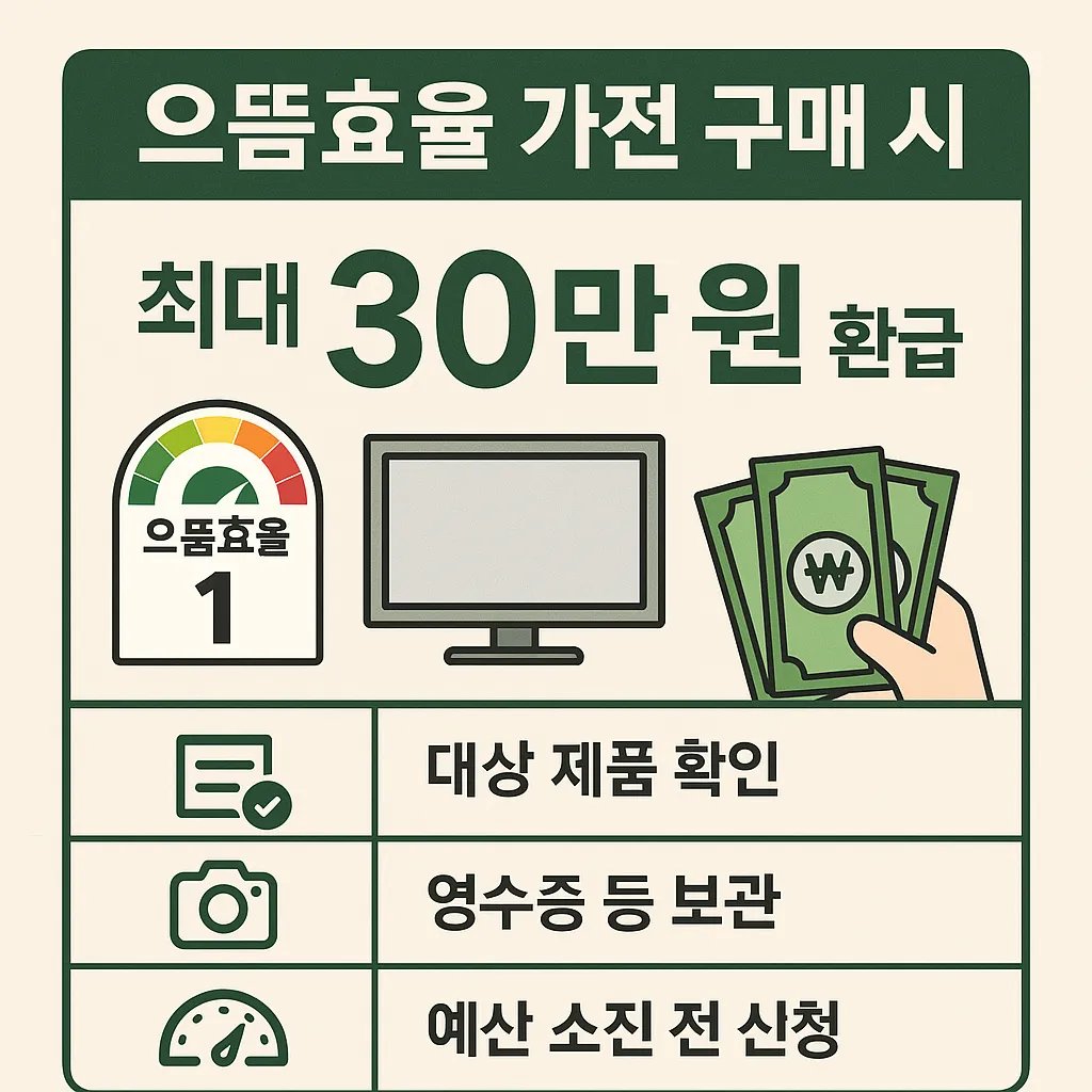 구매 전에 **제품 전면 또는 측면에 붙은 ‘에너지소비효율 등급 라벨’**을 꼭 확인하세요. 1등급(일부 품목은 2등급)이면 환급 대상입니다.