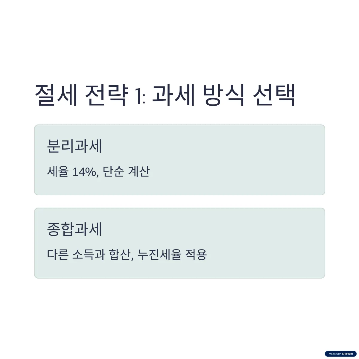 이때 자신에게 유리한 과세 방식을 선택하려면 사전 계산이 중요합니다. 분리과세는 세율이 14%로 단순하지만, 종합과세는 다른 소득과 합산하여 누진세율이 적용되므로 절세 효과가 달라질 수 있습니다.