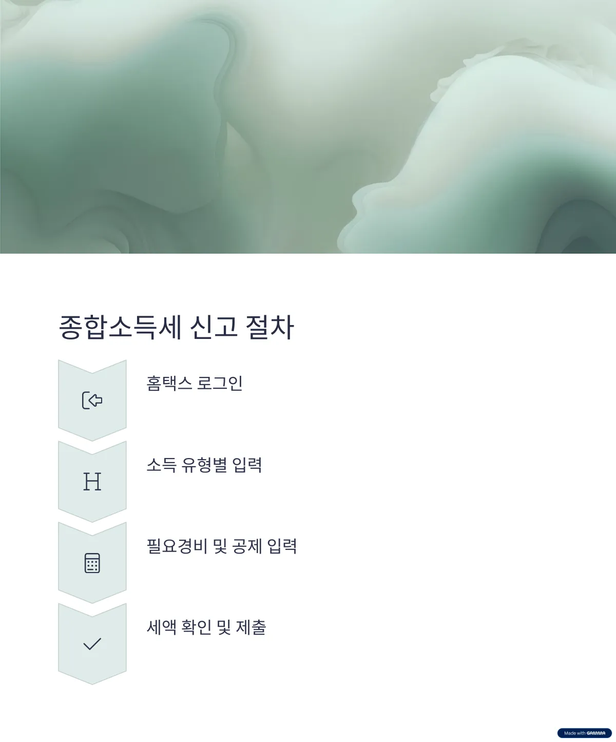 종합소득세 신고는 국세청 홈택스를 통해 진행할 수 있습니다. 절차는 다음과 같습니다.