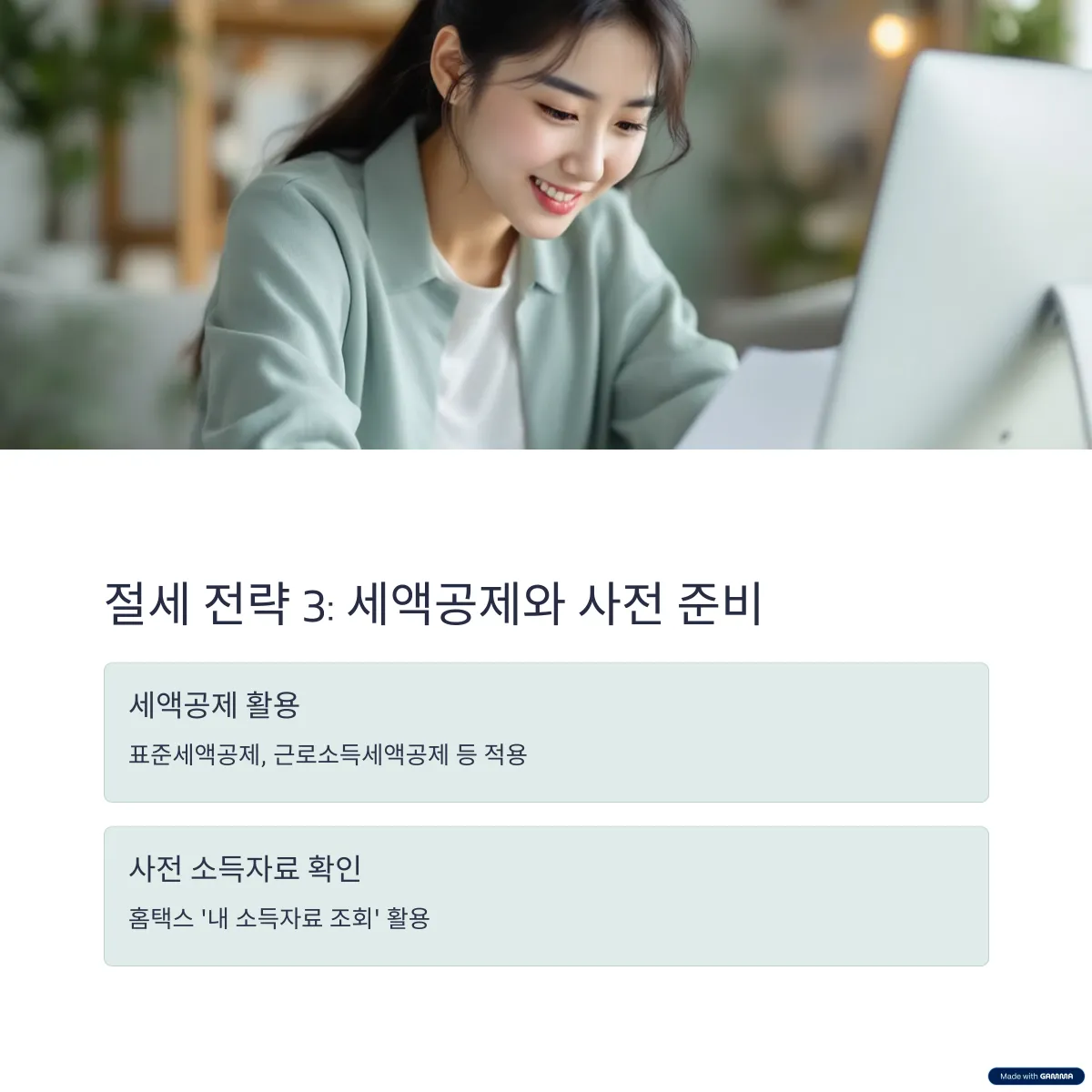표준세액공제, 근로소득세액공제 등 가능한 세액공제를 빠짐없이 적용해야 합니다. 세액공제는 직접 납부할 세금에서 차감되므로 효과가 큽니다. - 사전 소득자료 확인
