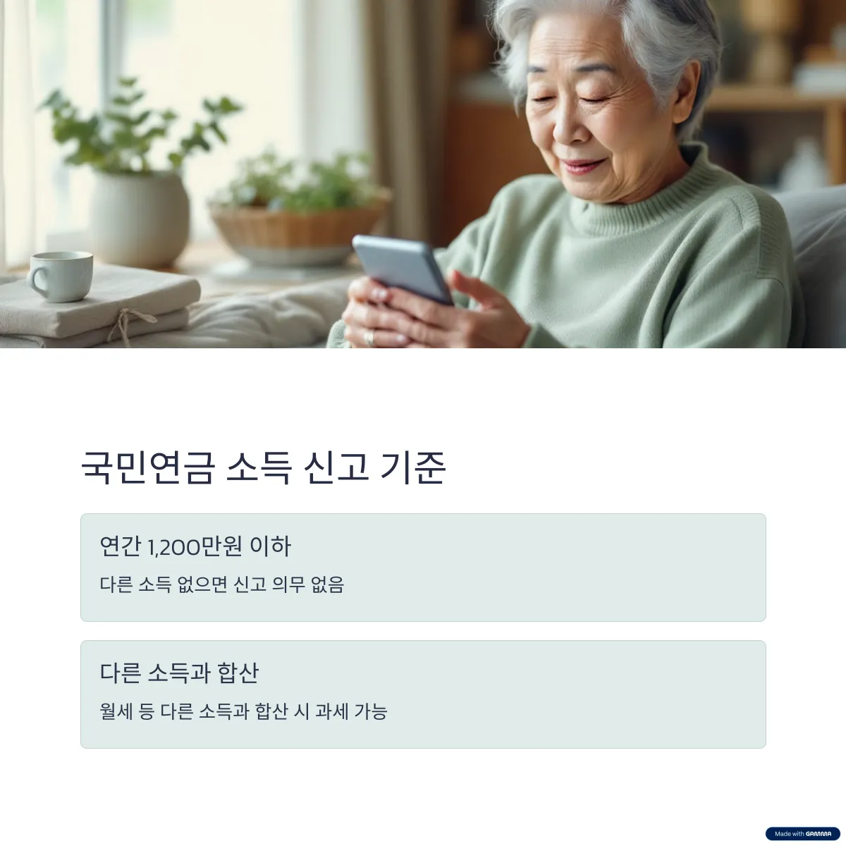국민연금은 연금소득으로 분류됩니다. 연간 수령액이 1,200만 원 이하일 경우에는 다른 소득이 없다면 별도의 종합소득세 신고 의무는 없습니다. 다만, 월세 수입 등 다른 소득과 합산되면 과세 대상이 될 수 있으므로 사전에 종합적인 검토가 필요합니다.